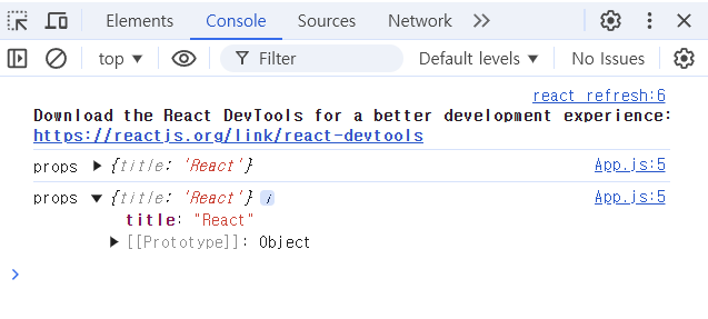 브라우저 콘솔창에 props Object가 출력된 것을 볼 수 있습니다. 출력 형식은 title : React라 출력됩니다.